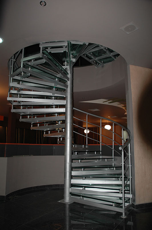 Винтовая лестница изготовлена из сборных элементов, стеклянные ступени закреплены с помощью специального клея